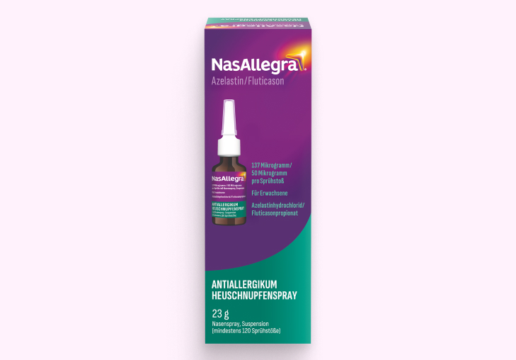Das Besondere an NasAllegra®? Es enthält die erste 2-in-1 Wirkstoffkombination aus Antihistaminikum und Glukokortikoid gegen Heuschnupfen, die rezeptfrei in der Apotheke erhältlich ist. Es vereint zwei bewährte Wirkstoffe gegen Allergien: Azelastin und Fluticason - gemeinsam wirken sie schnell und stärker als allein und helfen dir so noch besser deinen Heuschnupfen in den Griff zu bekommen.